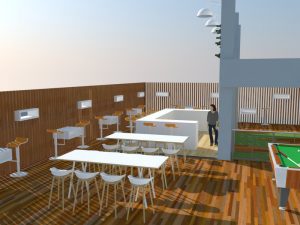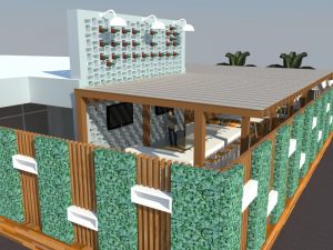 Incredible Brands, Incredible Structures (IBIS) was commissioned to design interior space and exterior entertainment lounge in North Miami, FL for an existing food and beverage business with access to the existing exits and an exciting street facing facade that allows semi-private indulging. The highlight of this design are the undulating and protruding Aluminum boxes that provide both a peak at the vibes inside, the street outside and alternate to provide even spaced seating on the interior. The handicap ramp was designed so that it can also be used as stairs with a 6″ rise by not following the ramp. Incredible!